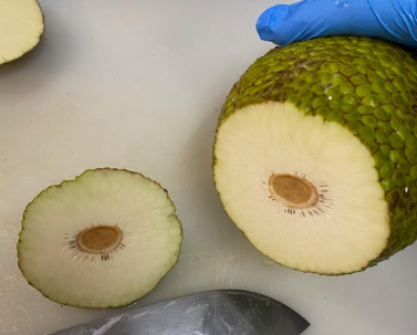 ʻUlu fruit can appear full-size and ready for harvest before the starches have fully developed, leading to inferior quality fruit for most culinary applications. These “Full-size Immature” or “Green” fruit are currently accepted from co-op members under the Grade C specification – please review the Harvesting Guidelines for details.