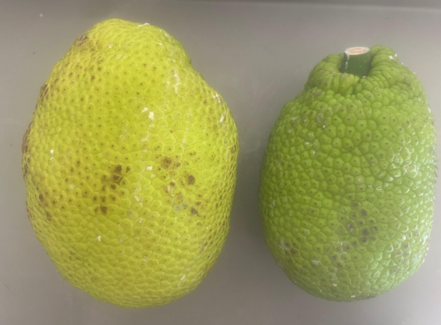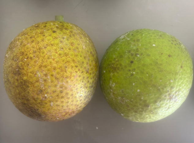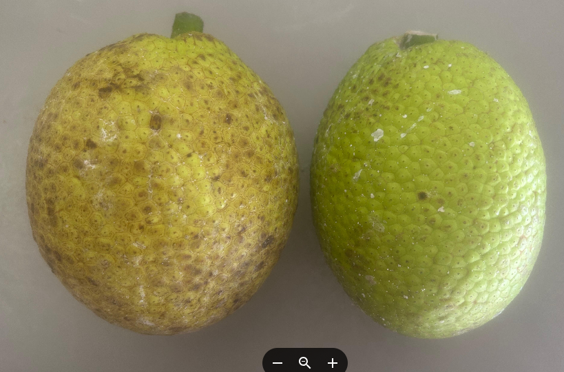 Breadfruit maturity indicators can be different for each variety. Below are some photos showing Mature fruit on the Left and Full-size Immature fruit on the Right, for the following varieties (from left to right): Maoli, Otea, Lipet, Puou