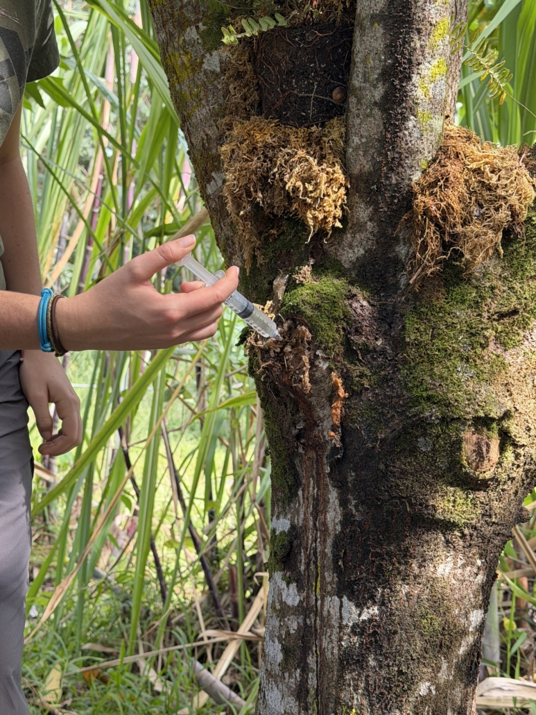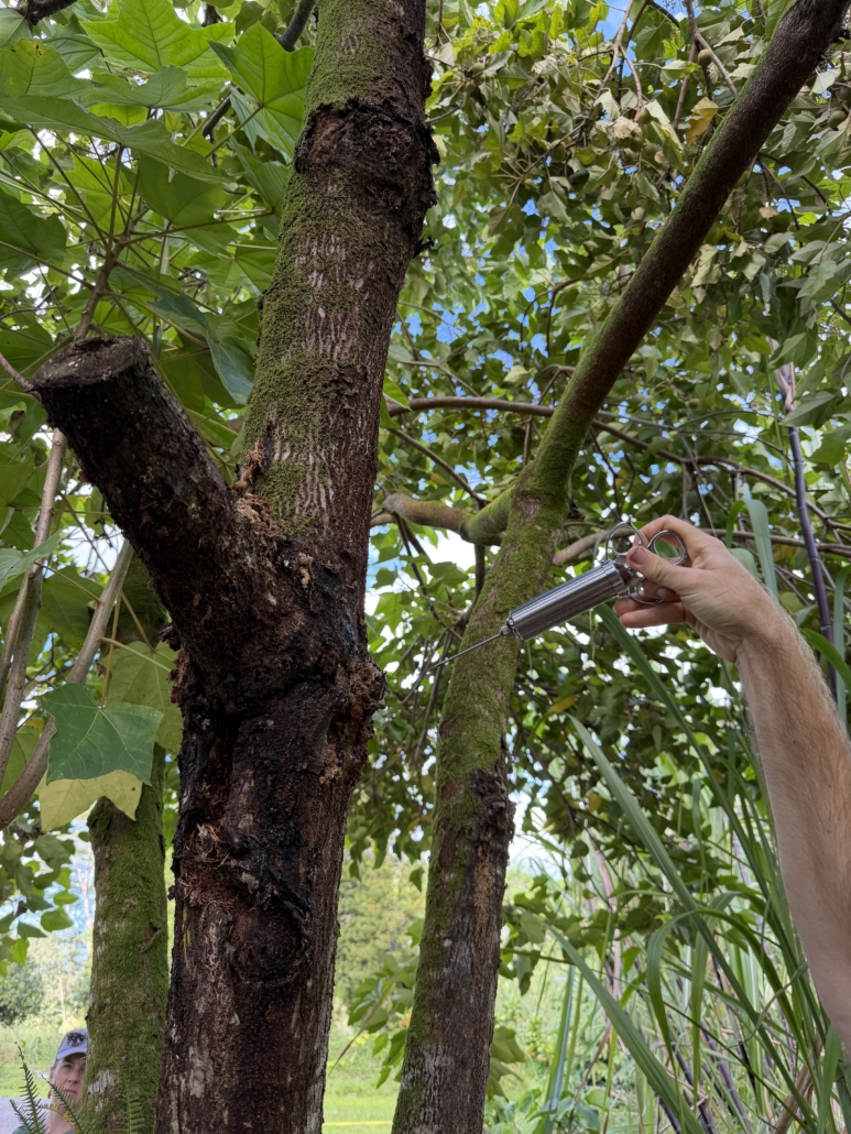 At a restoration site in Keaukaha Military Reservation, within the ahupuaʻa of Waiākea in Hilo, Hawaiʻi, Liko Nā Pilina ( a hybrid ecosystems project working through UH Hilo) observed extensive QLB damage to kukui and ‘ulu trees. These trees serve as important canopy species that provide shaded habitat for native seedlings. In response, they are testing an indigenous nematode, Heterorhabditis indica, as a biological control agent against the QLB in kukui and ‘ulu trees. When injected into infected trees, they target and kill QLB larva, offering a promising strategy to reduce the QLB population and protect our native and culturally important trees.